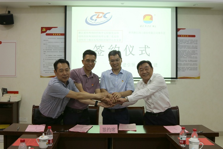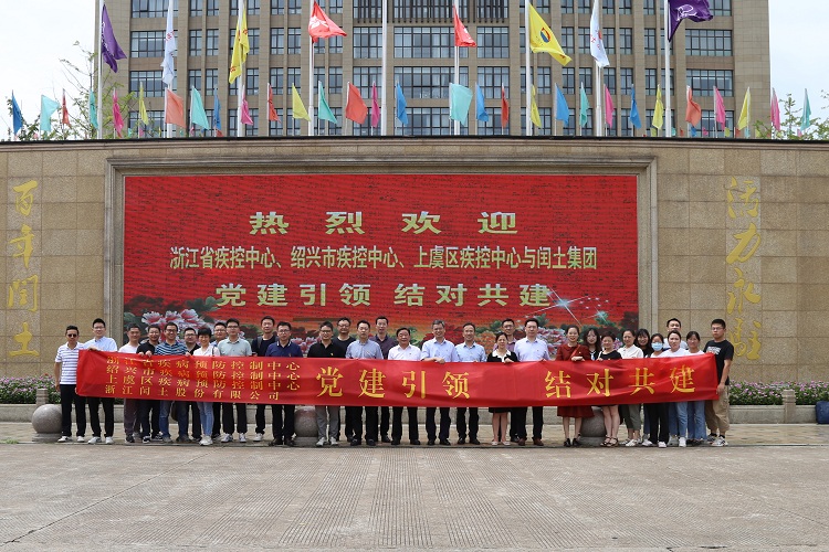 仪式上,浙江省疾控中心楼晓明副主任,绍兴市疾控中心支部书记孟海滨,上虞区疾控中心书记方海平主任与公司党委副书记阮兴祥同志共同签署四方联建协议书。