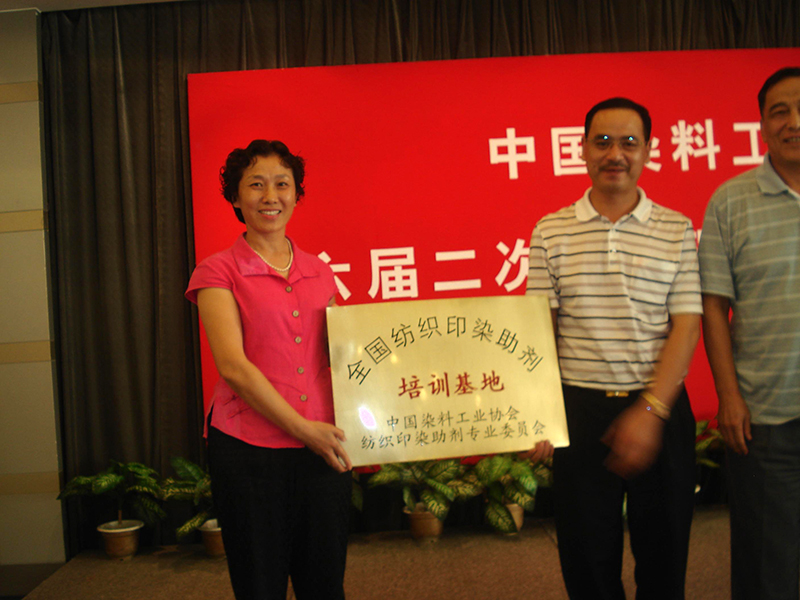 阮加春总经理代表中国染料协会理事会颁发“全国纺织染料助剂培训基地”牌匾。