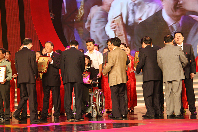 10月11日,阮加春总经理在第八届全国残运会倒计时一周年大型爱心助残晚会上接受中国残联主席张海迪(坐轮椅者)颁发“爱心企业”奖牌。浙江省省长吕祖善等领导出席了本次活动。